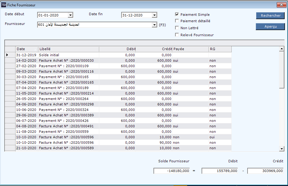 Cet écran affiche la liste des factures et des paiements d’un fournisseur entre deux dates avec un solde de début d’année.