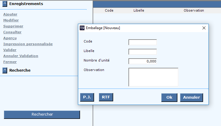 A partir de cet écran vous pouvez ajouter, modifier, consulter et supprimer un type d'emballage d'un article.
