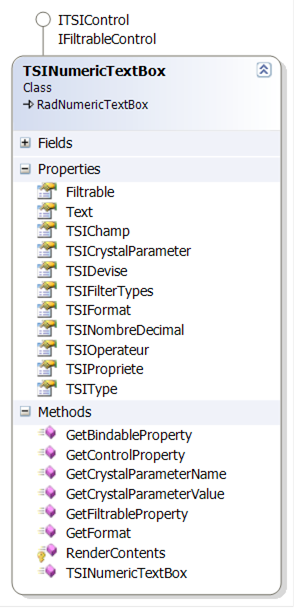 TSINumericTextBox hérite de la classe « RadNumericTextBox » de Telerik et implémente l’interface ITSIControl et IFiltrableControl.